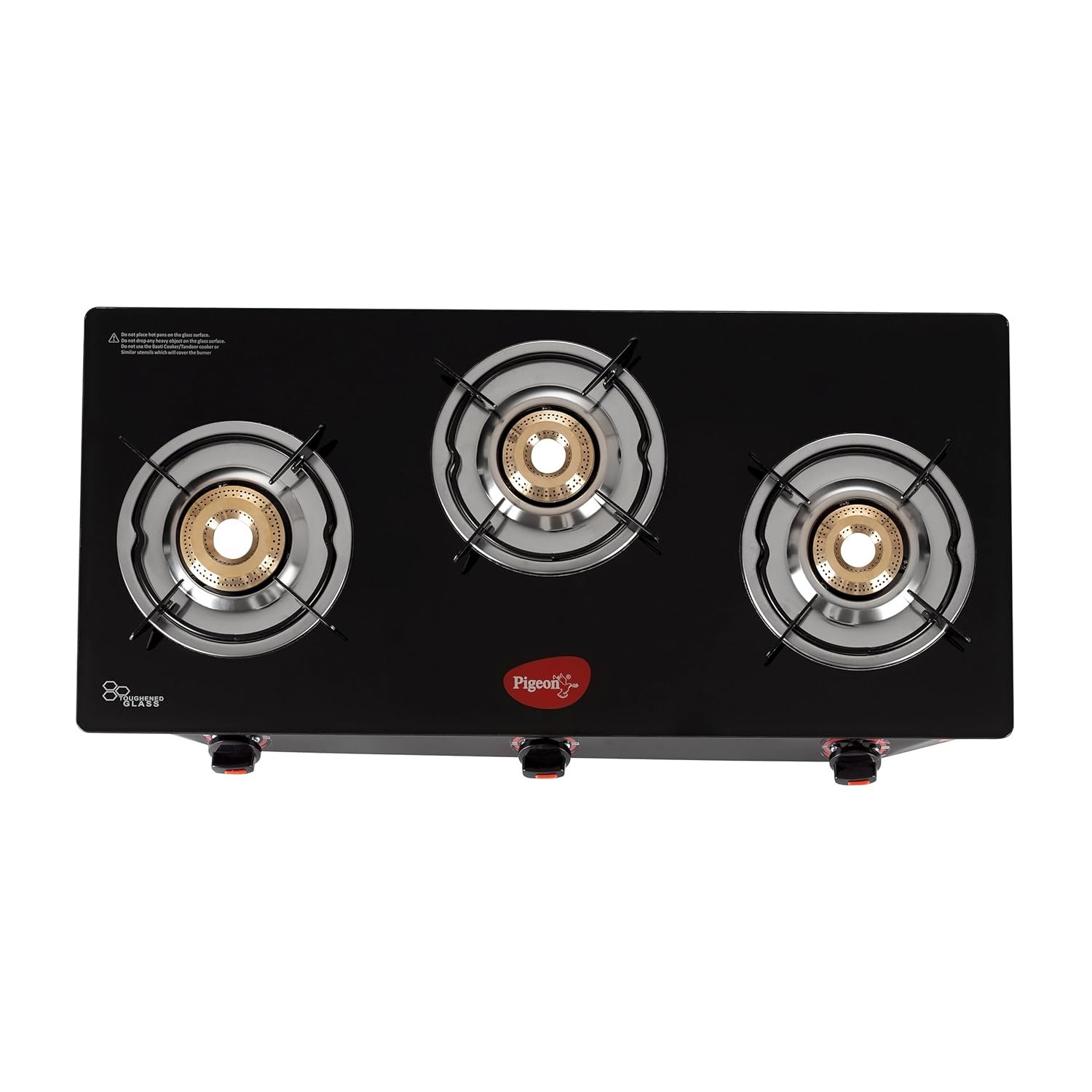 Gas Stoves pigeon by stovekraft aster 3 burner gas stove with high powered brass burner gas cooktop, cooktop with glass top and powder coated body, black, manual ignition, standard (14267)