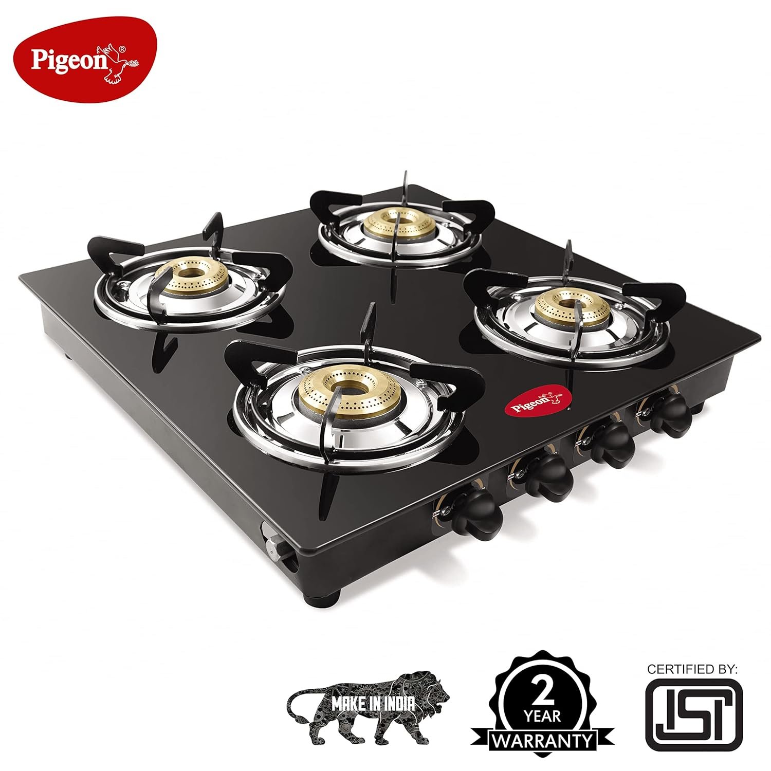 Gas Stoves pigeon by stovekraft aster gas stove 4 burner with high powered brass burner, gas cooktop with glass top and powder coated body, black, (14297) – manual ignition