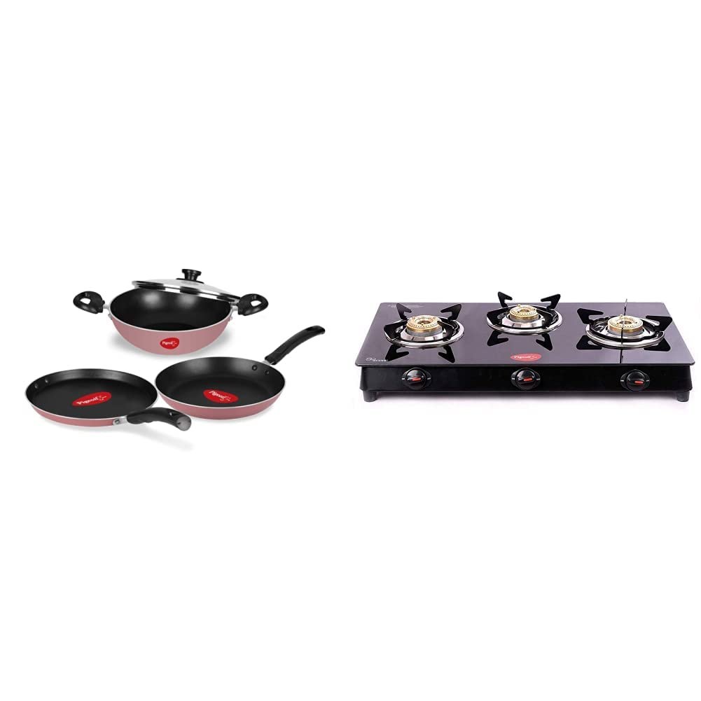 PIGEON BY STOVEKRAFT BASICS ALUMINIUM NON-STICK COOKWARE SET WITH ONE LID (PINK)- SET OF 3 AND GLASS TOP ASTER 3 BURNER PI_0665