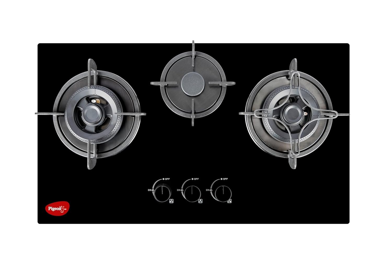 PIGEON TWINSPARK HOB 3 BURNER MULTI SPARK INTEGRATED AUTO IGNITION WITH FORGED BURNERS, SCRATCH RESISTANT 6 MM THICK TOUGHENED GLASS TOP FOR EASY CLEANING – BLACK PI_0729