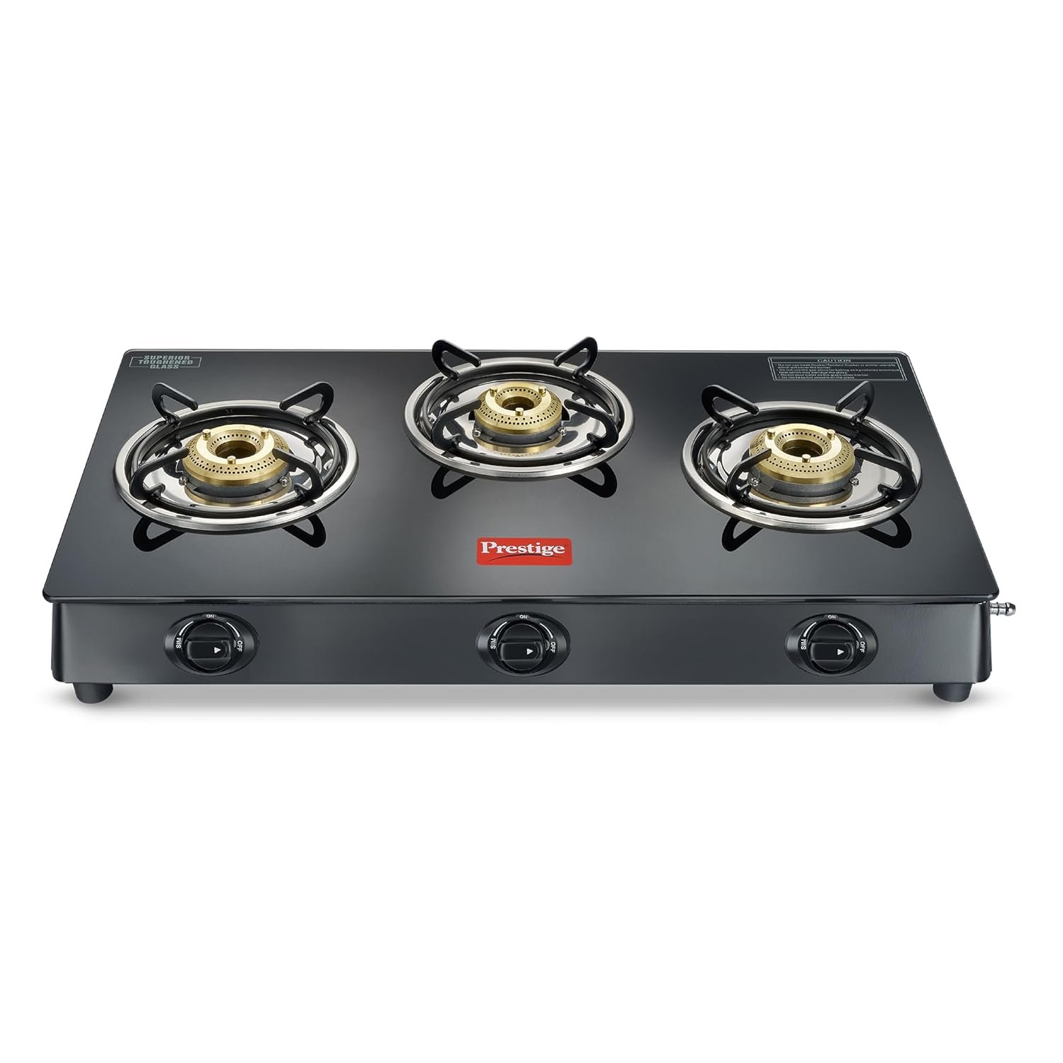 PRESTIGE IRIS TOUGHENED GLASS-TOP 3 BRASS BURNER LPG GAS STOVE | BLACK SPILL PROOF DESIGN | ERGONOMIC KNOB | TRI-PIN BURNERS |OPEN PI_0730