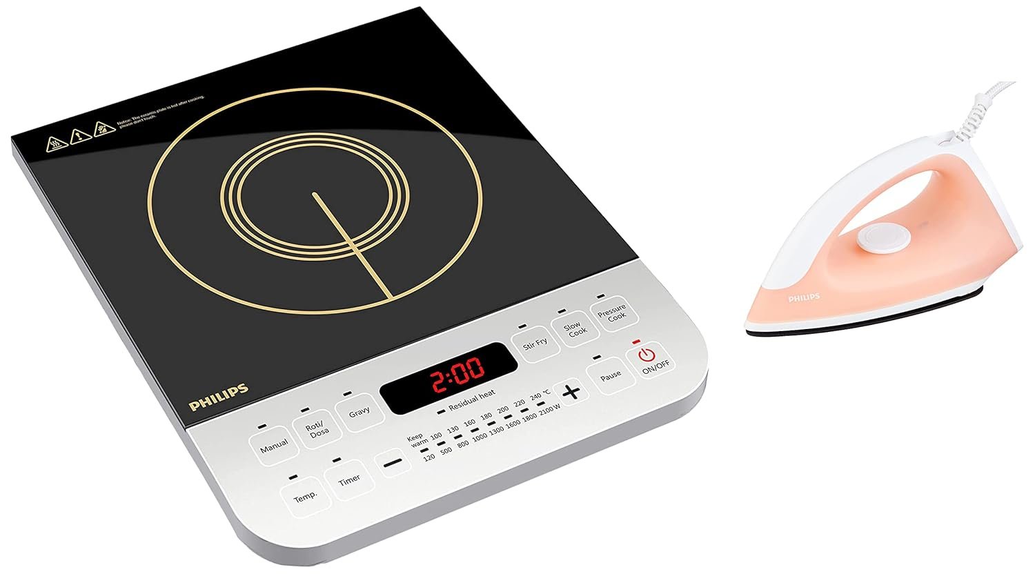 PHILIPS VIVA COLLECTION HD4928/01 2100-WATT INDUCTION COOKTOP (BLACK) & CLASSIC GC097/50 750-WATT DRY IRON (PEACH) COMBO PI_0637