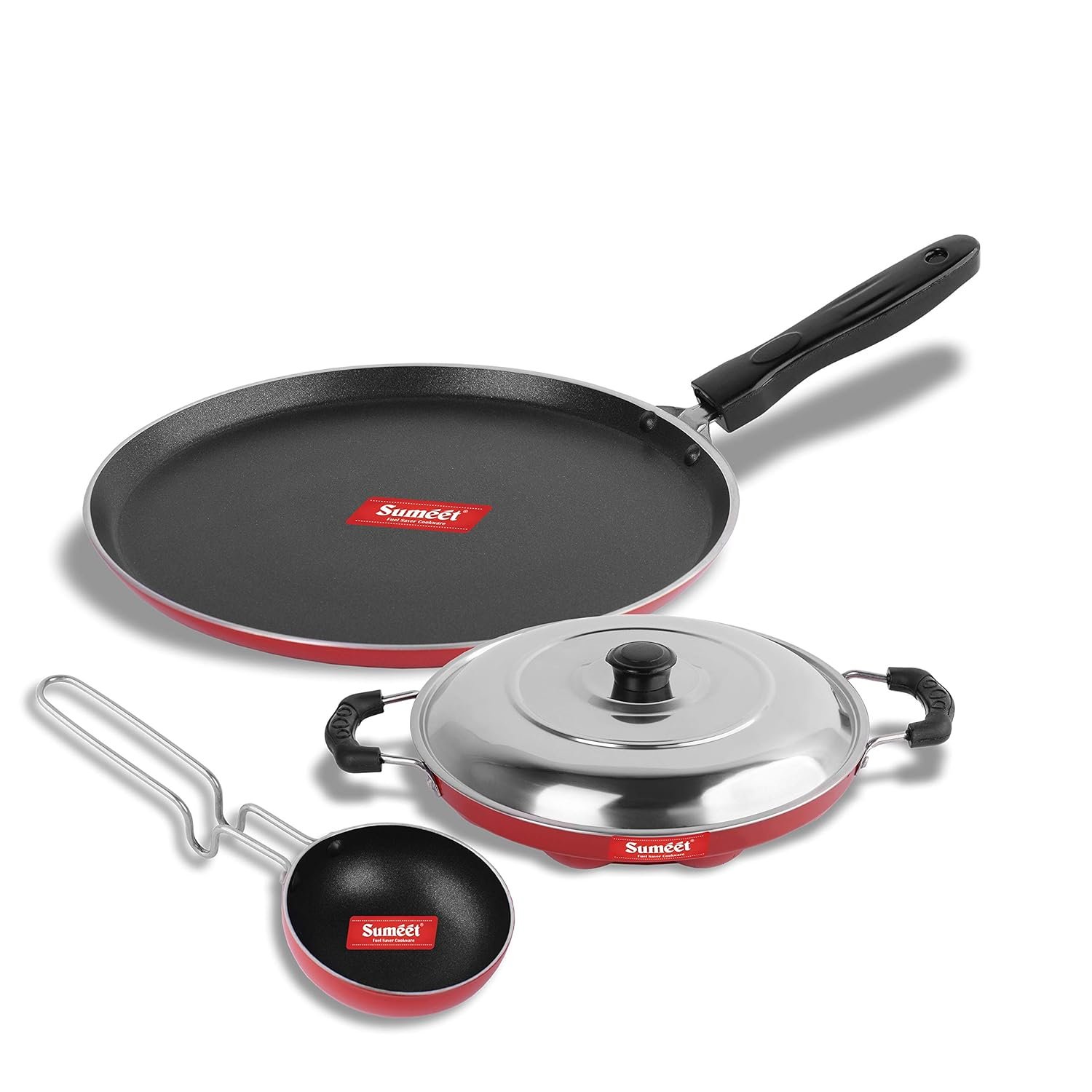 SUMEET 2.6MM THICK NON-STICK ROISIN COMBO SET (DOSA TAWA – 26.5CM DIA + GRILL APPAM PATRA WITH LID – 23CM DIA + TADKA PAN – 10CM DIA) PI_0692