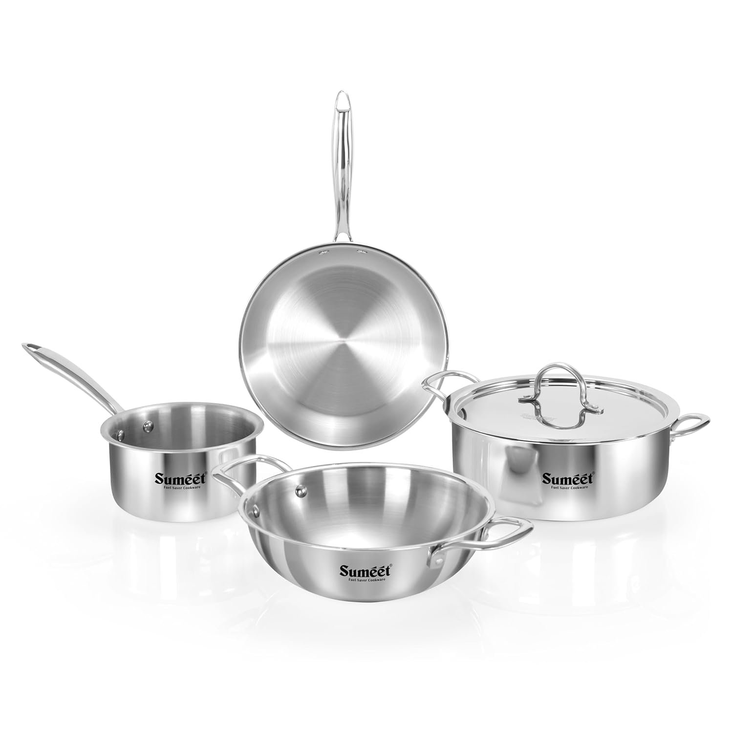 SUMEET COOK SMART TRIPLY STAINLESS STEEL 5PC INDUCTION BASE COOKWARE SET OF DEEP KADAI – 20CM – 1.7L, FRYPAN – 20CM – 1 LTR, SAUCEPAN – 14CM, CASSEROLE – 20CM – 2.9LTR & STEEL LID, PACK OF 5 – SILVER PI_0696