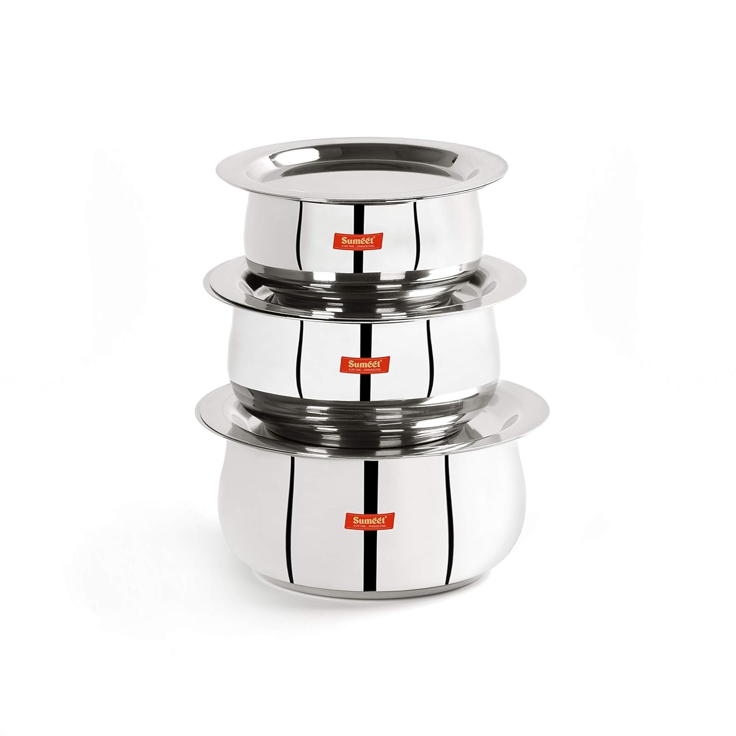 SUMEET STAINLESS STEEL 3 PIECES HANDI POT SET, 1.1 LITERS, 1.3 LITERS, 1.7 LITERS, 3 PIECE (WHITE, POLISHED) PI_0693