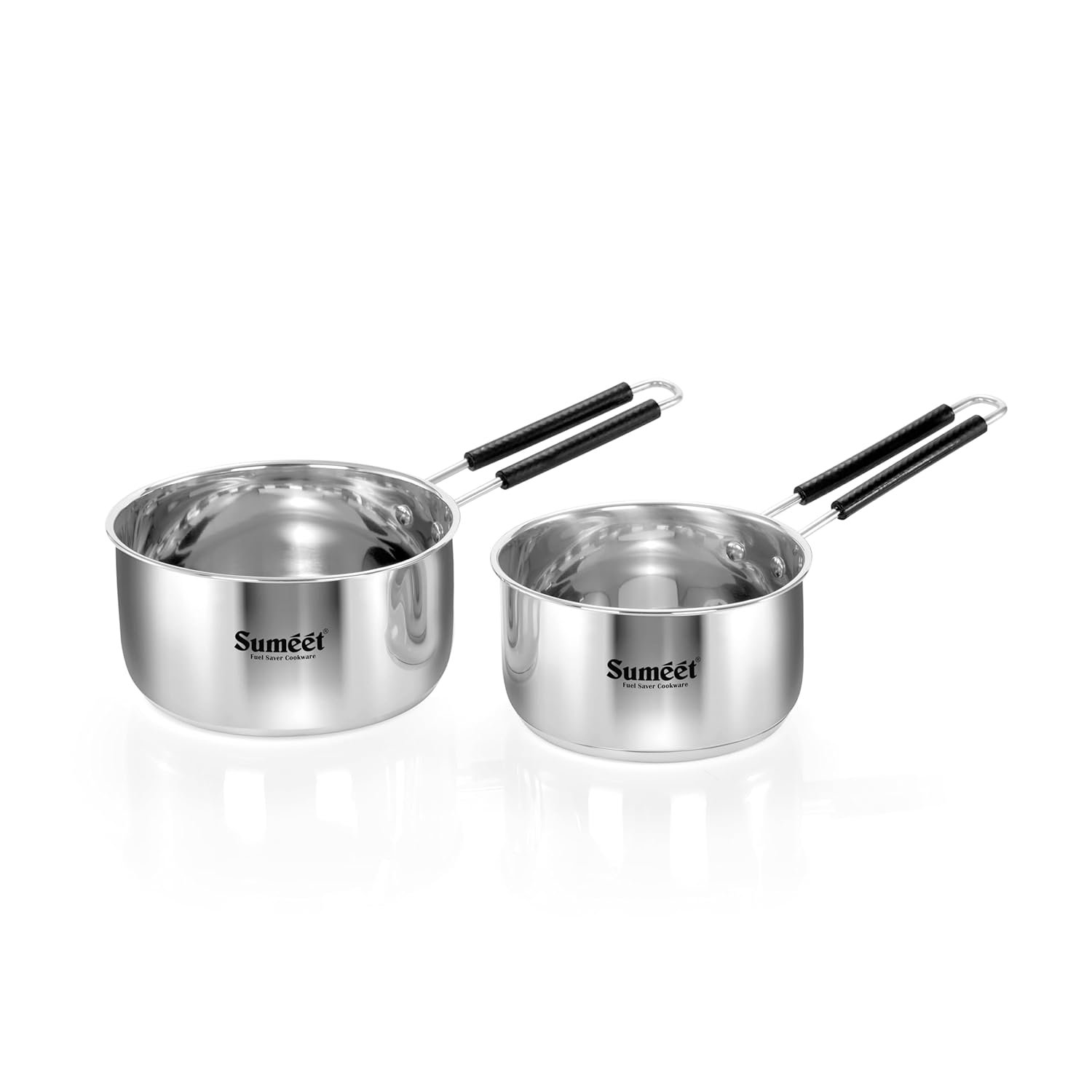 SUMEET STAINLESS STEEL INDUCTION BOTTOM GAS STOVE & INDUCTION FRIENDLY SAUCEPAN/MILK PAN/TEA PAN SET OF 2 PCS WITH RIVITED BACELITE WIRE HANDLE, 900ML & 1250ML / 12 & 14CM DIA, SILVER PI_0689