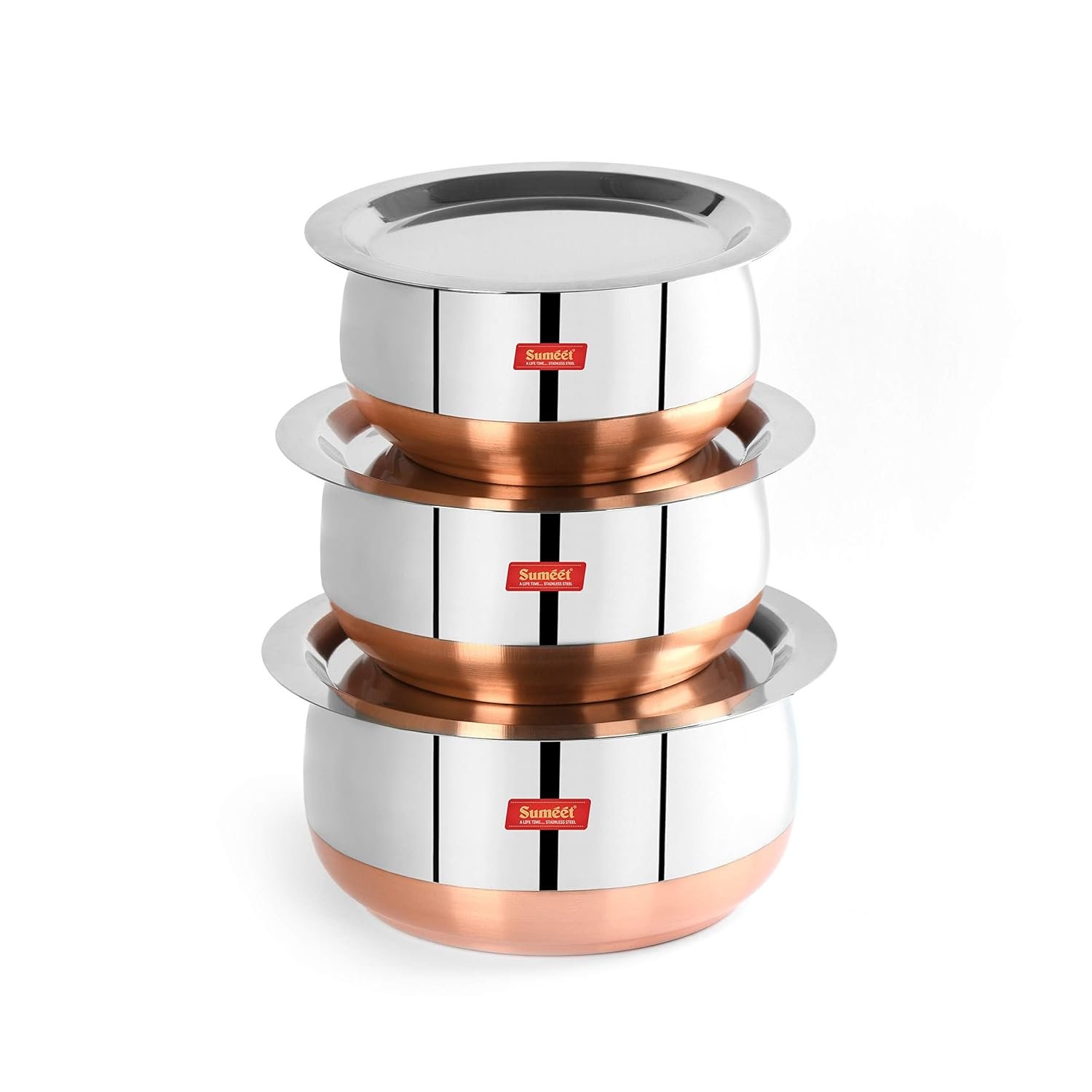 SUMEET STAINLESS STEEL COPPER BOTTOM COOKWARE SET | 3-PIECE BELLY-SHAPED TOPE/POT WITH LIDS (1.1L, 1.4L, 1.75L), SILVER PI_0694